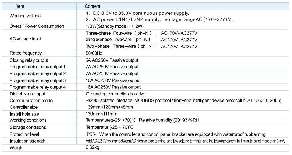 The application of this controller on a variety of ATS (load automatic switch system) is fully considered. The controller can be directly used on specialized ATS, contactors made ATS, air circuit breakers made ATS and etc.
